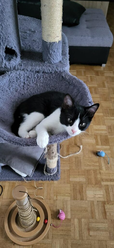 Atom porte parfaitement son nom : c’est un véritable concentré d’énergie ! Âgé de 3 mois et demi, ce jeune chaton est très joueur, curieux et dynamique. Il adore courir, sauter et transformer le moindre objet en terrain d’aventure.