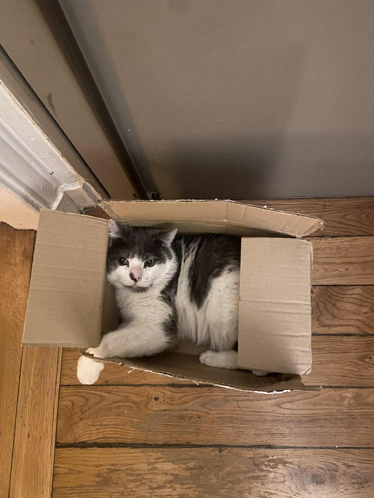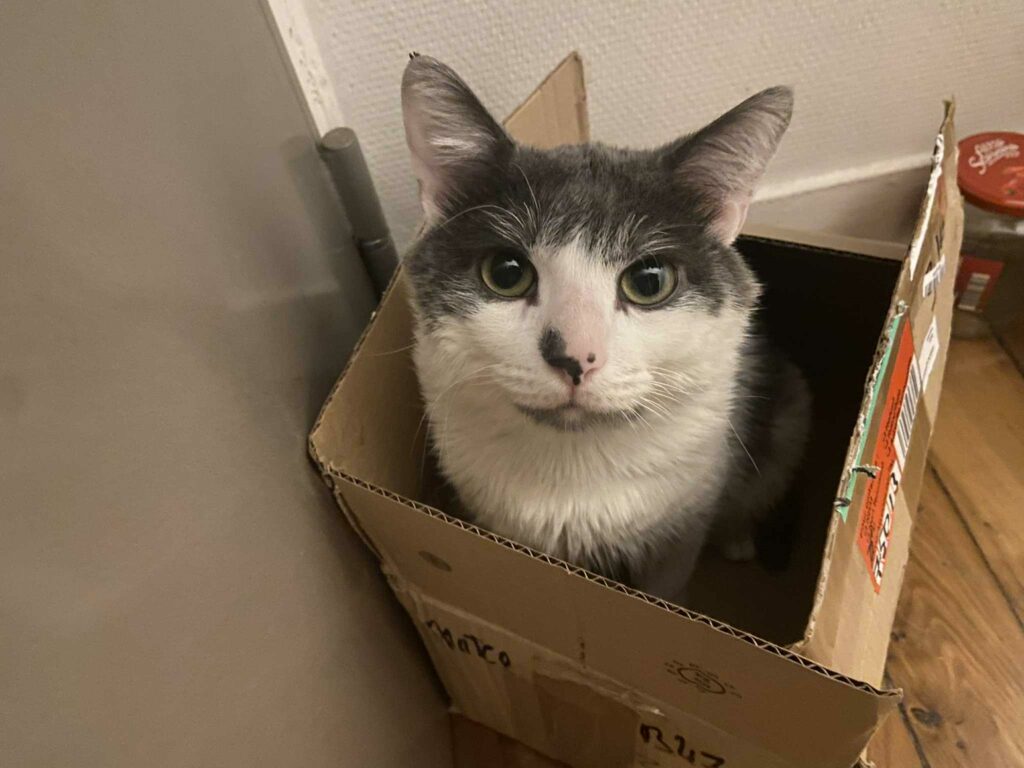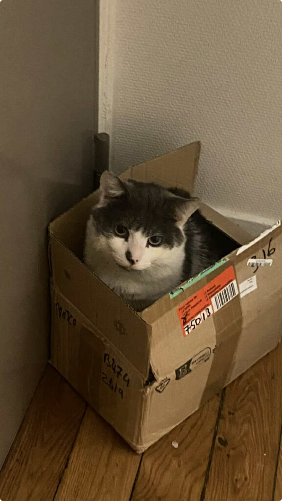 C’est un chat très calme avec un tempérament très doux et ce, même si comme tous les jeunes chats il aime aussi jouer… en particulier avec sa pelote de laine préférée ! C’est aussi un amour inconditionnel des cartons !