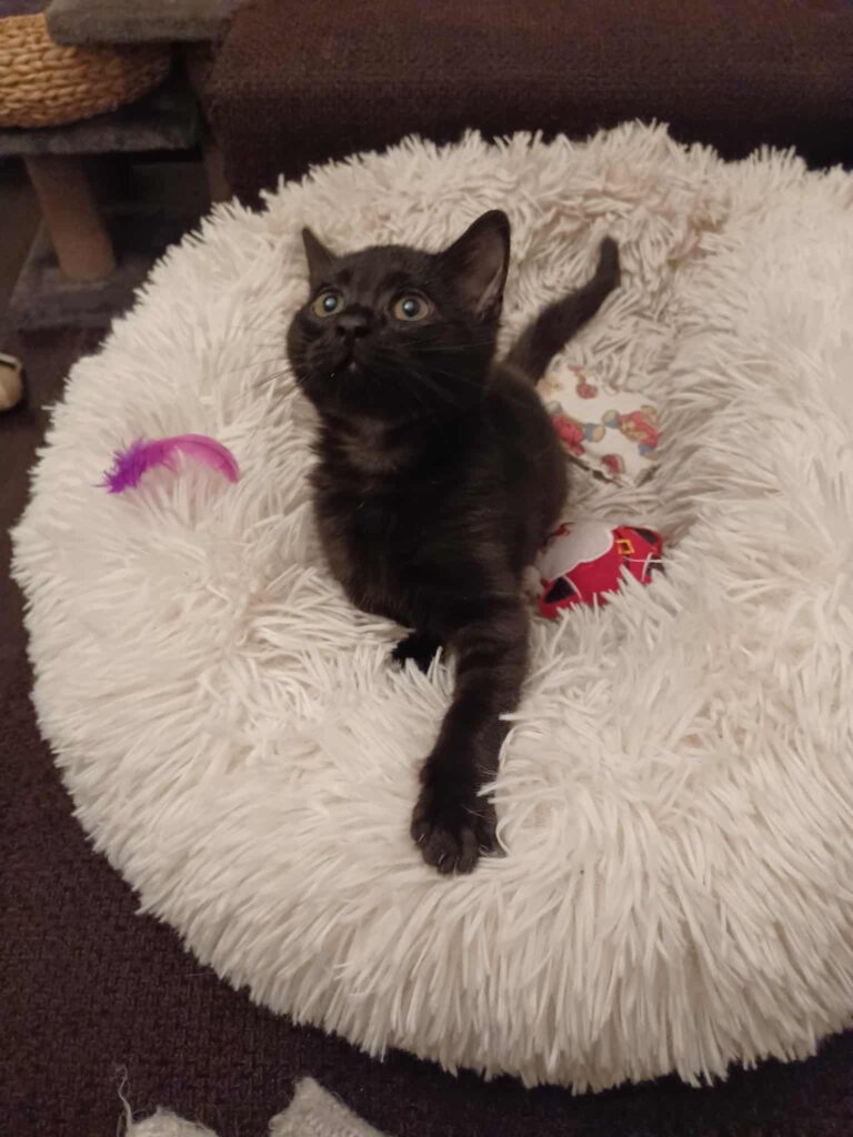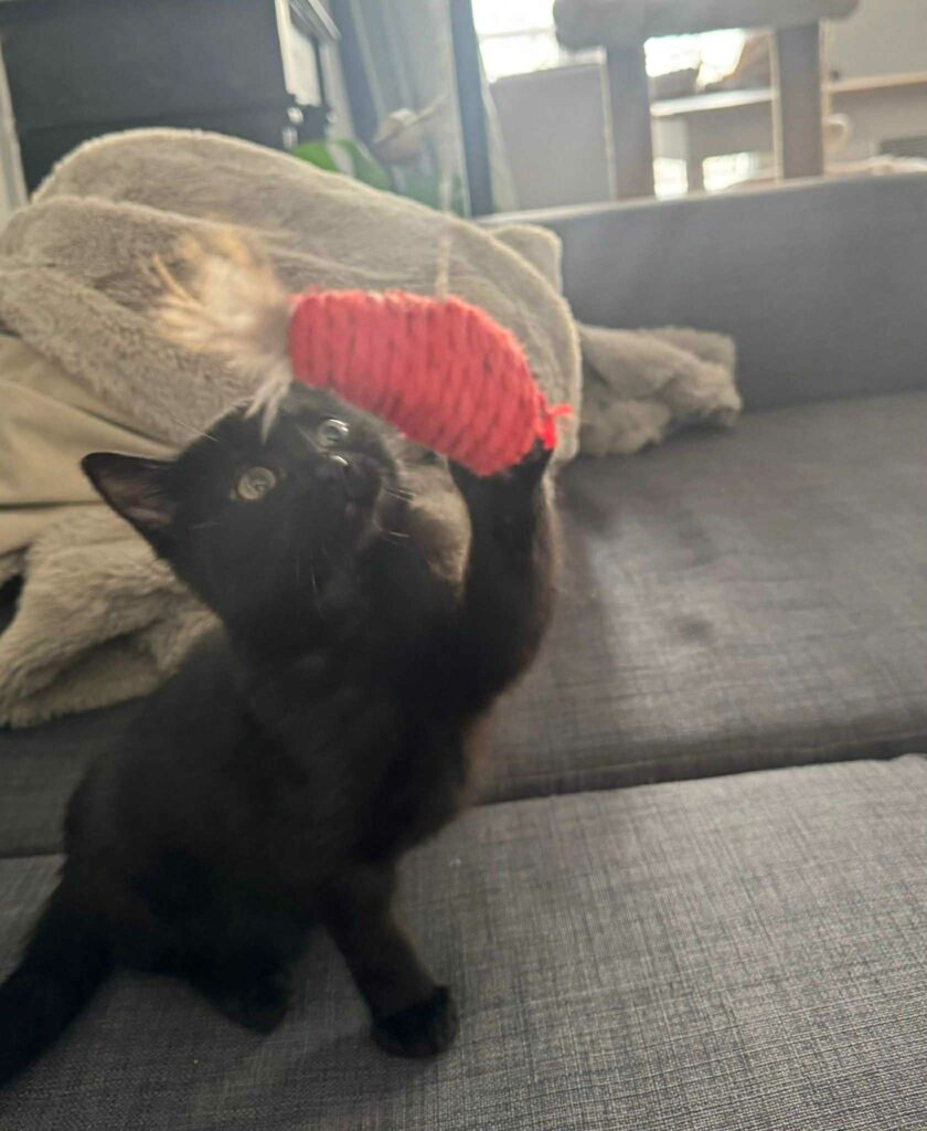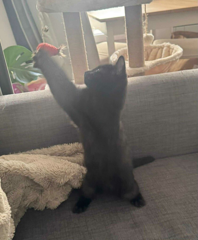 Fripon peut passer des longs moments à bondir derrière sa petite canne à pêche, ce qui est toujours très rigolo à observer. Toujours en mouvement, il gambade, saute et court partout ! Un petit acrobate qui met de la vie dans n’importe quel nouvel espace.
