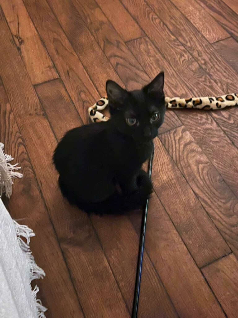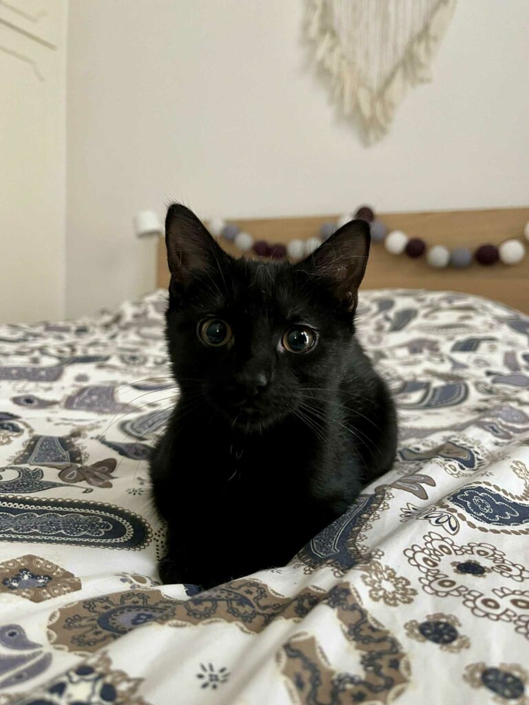 Makito est une jolie chatonne au beau pelage noir et de grands yeux marrons âgée de 3 mois. Très sociable, elle ronronne à la moindre caresse.
