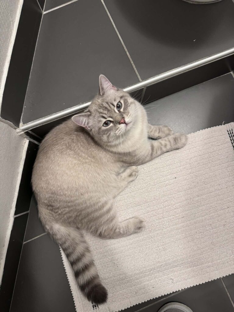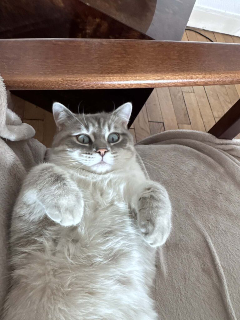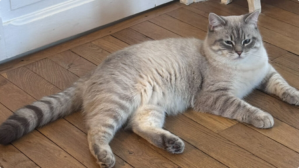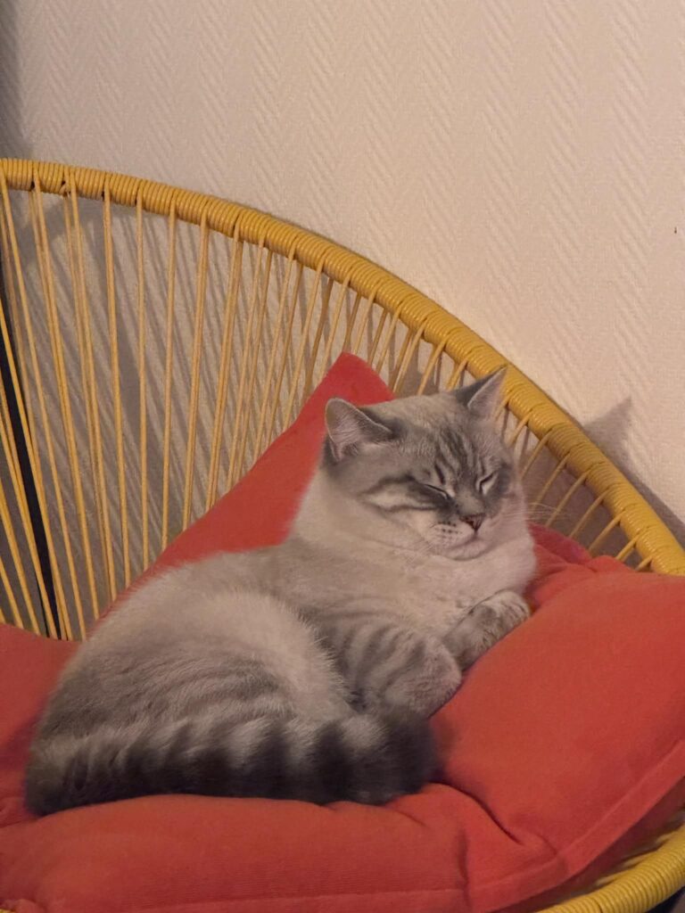 Patapouf a également une petite particularité : il adore faire ses griffes sur un griffoir vertical (perpendiculaire au sol), indispensable pour son bien-être. C’est un chat drôle, doux et très attachant, qui apporte une présence apaisante dans la maison et charme tous ceux qui le rencontrent.