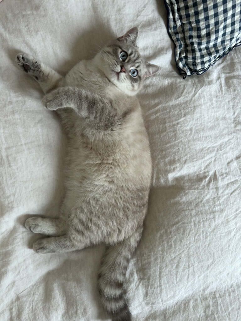 Plutôt pépère, Patapouf aime profiter des moments calmes sur le canapé ou sur le lit, tout près de nous… mais toujours en mode observation. Il garde son petit côté indépendant tout en appréciant la présence humaine.