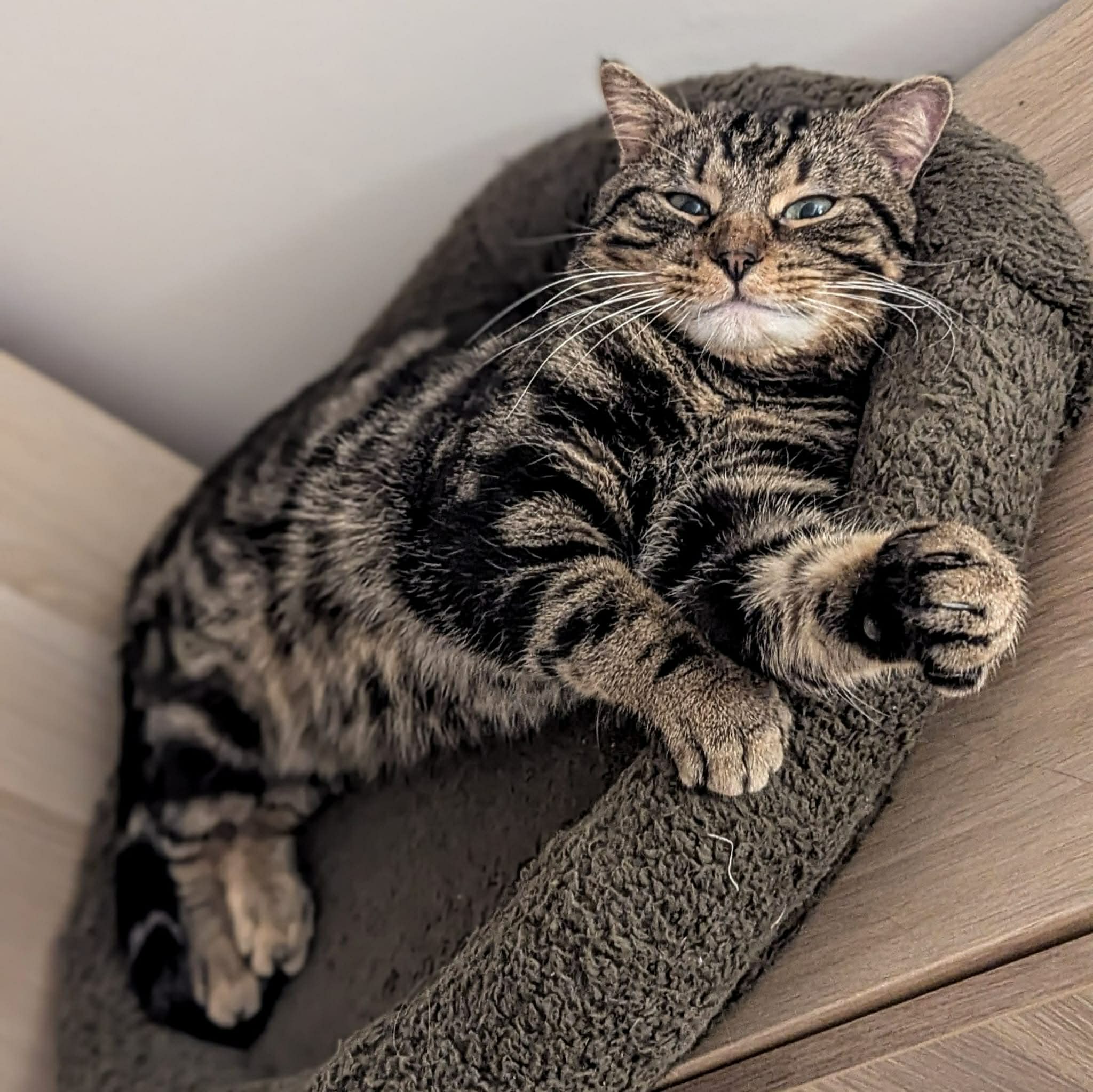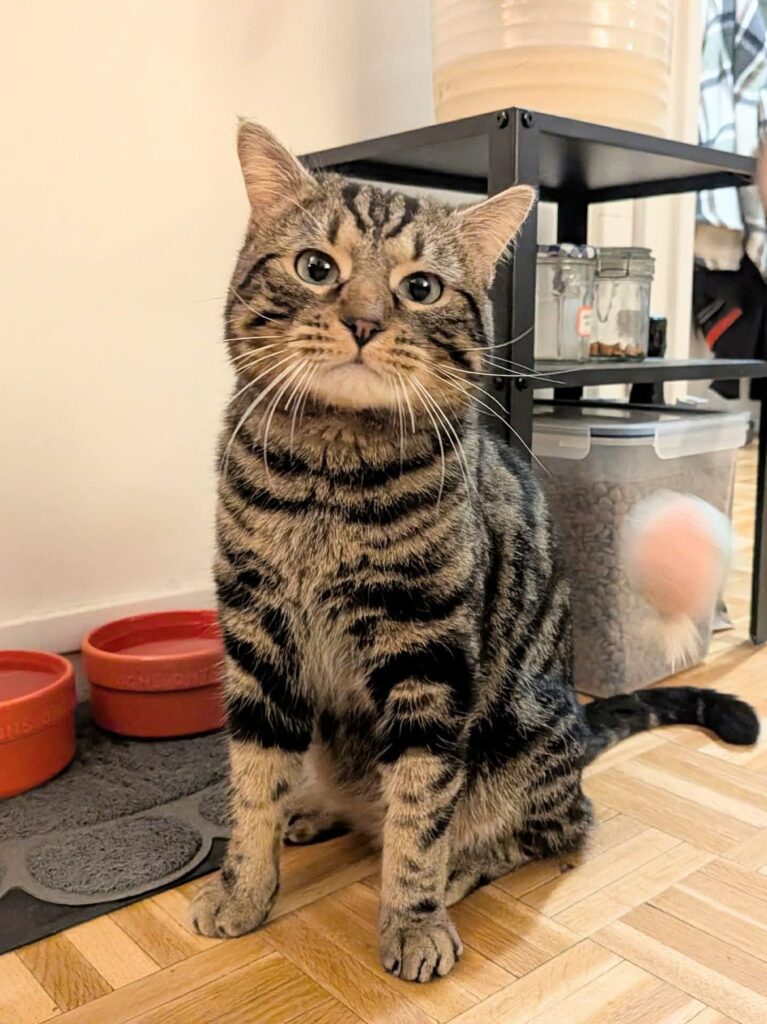 Discret mais jamais bien loin, Tigrou aime garder un œil sur son humain. Il regarde droit dans les yeux, comme pour créer un vrai lien. Curieux et observateur, il apprécie aussi les moments de jeu, seul ou avec d’autres chats avec qui il s’entend très bien.